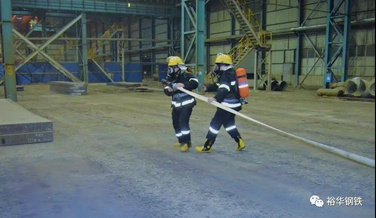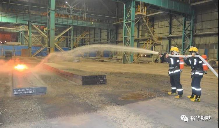演練模擬場景為寬帶鋼廠板坯庫發生火災事故,當班班長立即通知調度啟動分廠應急預案,工段及分廠組織人員進行救援,但因火勢較大無法得到有效控制,分廠立即通知公司煤防站前來現場支援。